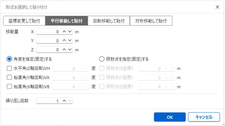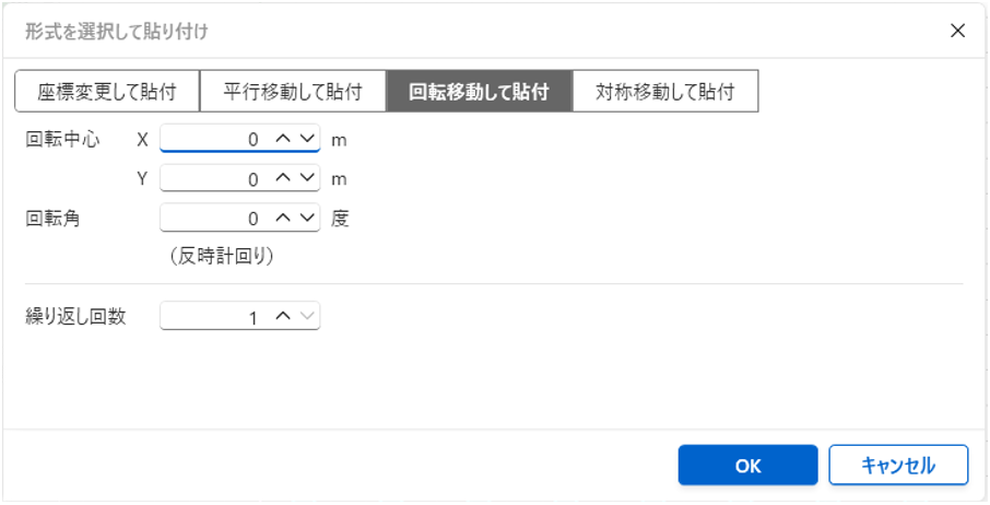 「平行移動して貼付」「回転移動して貼付」は、複写を繰り返す回数を設定できます。