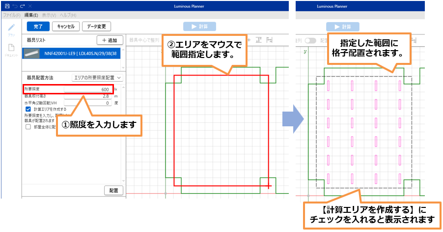 柱間などの任意のエリアに対して、指定した照度から格子配置で器具を配置します。