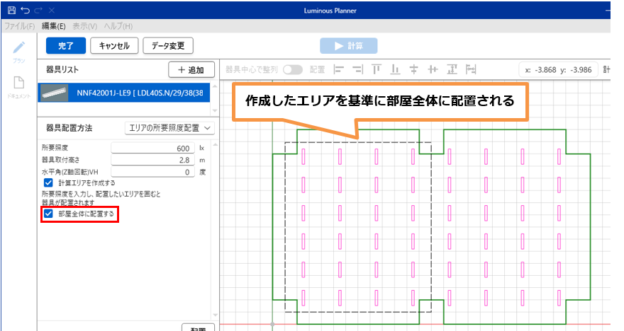 :指定したエリアを基準として、部屋全体に器具を配置します。