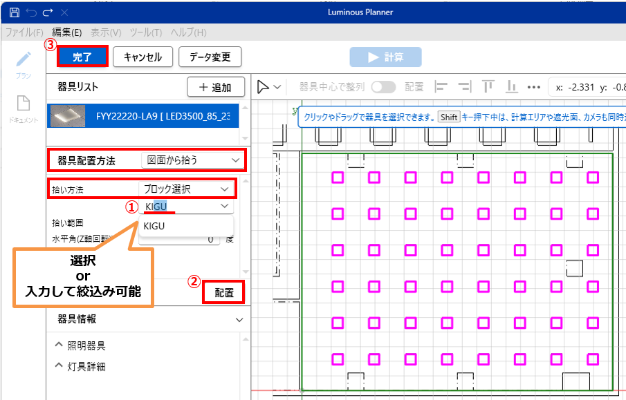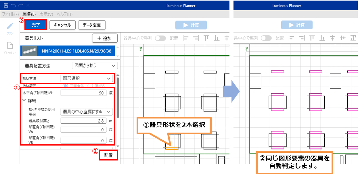 図面の器具の図形を選択することにより、器具位置を拾いだします。入力する条件はルミナスプランナーの器具位置追加方法と同じです。