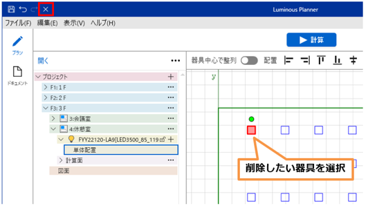 メインビューより削除する器具を選択し(赤で表示)、アクションバー