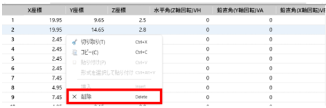 座標画面から削除する器具の行を右ボタンクリック→「削除」を選択します。