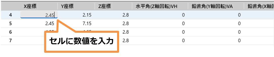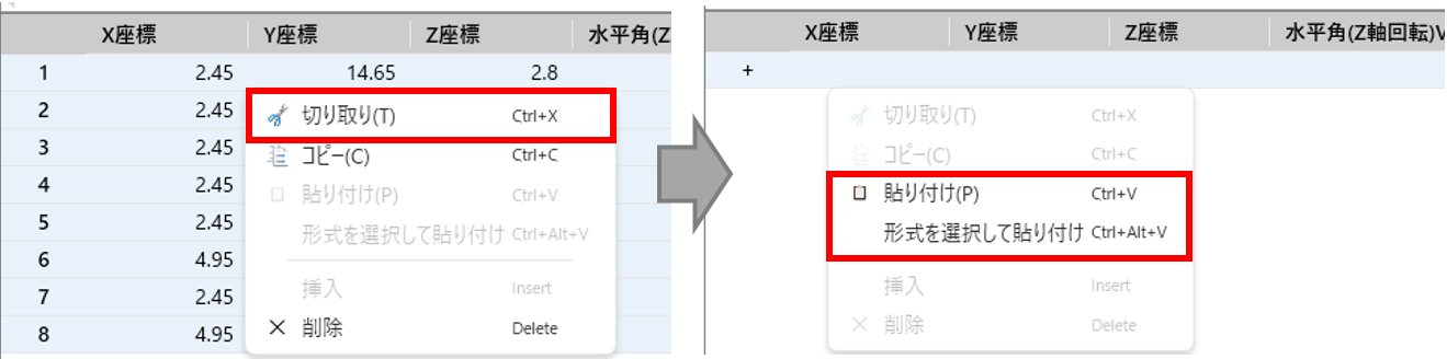 :座標画面で器具座標の行を複数選択し、右ボタンクリックの[切り取り]を選択します。 次に空白の行をクリックして選択し、右ボタンクリックから貼り付けたい方法を選択してください。 (貼り付け方法の種類は「形式を選択して貼り付け」を参照)