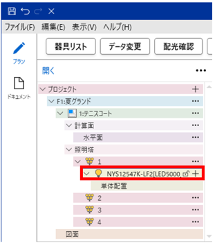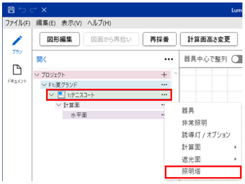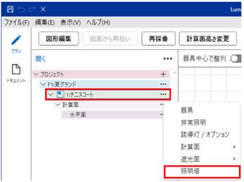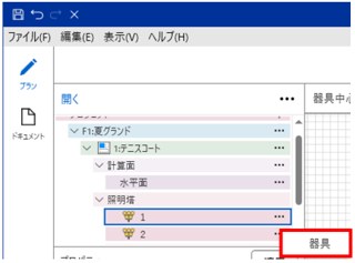 - ツリーより照明塔(例:1)を選択し、「…」→「器具」を選択します。