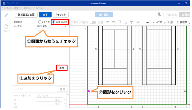 - 照明塔の図形が図面に描かれている場合は、下図のように図形を選択、追加することで照明塔を配置できます。