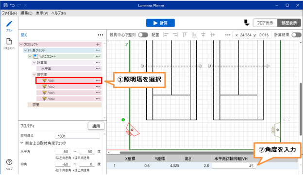 照明塔を向ける方角を変更する場合は、ツリーより該当の照明塔を選択し座標の「水平角(Z軸回転)」に角度を入力します。