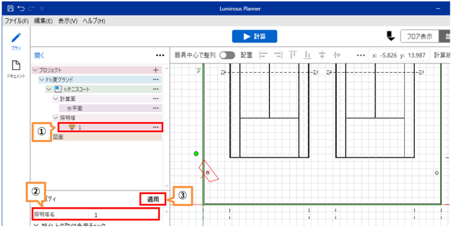 [プロパティ]画面の「照明塔名(例:1)」を入力後、「適用」をクリックします。