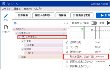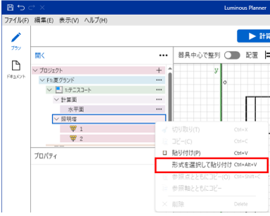 - ツリーよりスペース(例:テニスコート)を選択し、右ボタンクリック「形式を選択して貼り付け」を選択します。