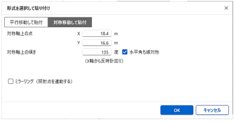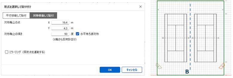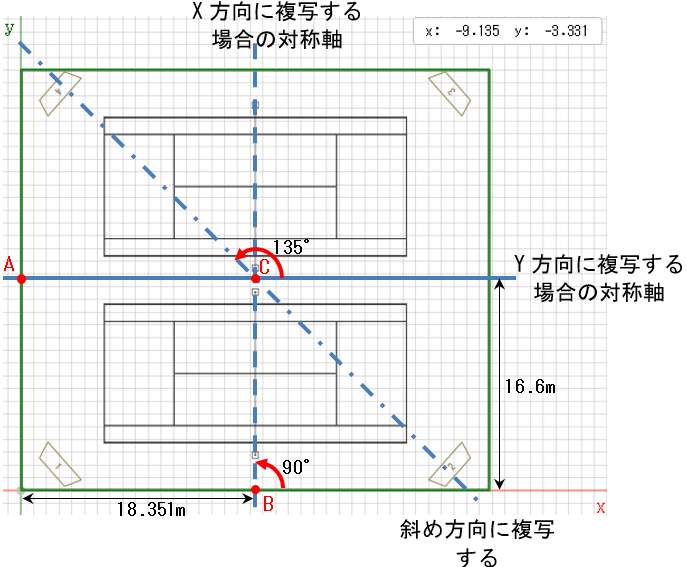 - 「1」の照明塔を「2」の位置に複写する場合、対称軸上の点は B点とします。B点の座標を設定します。
