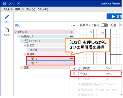 [Ctrl]キーを押しながらツリーより照明塔「1」「2」を選択し、右ボタンクリック「コピー」を選択します。