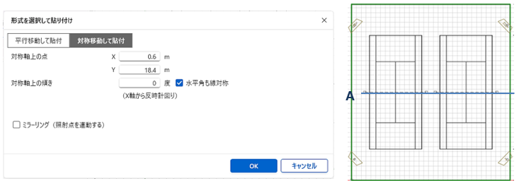 - 「1」「2」の照明塔を「3」「4」の位置に複写する場合、対称軸上の点は A点とします。