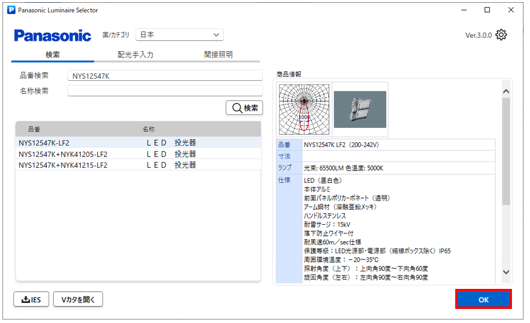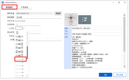 - 照明器具検索ダイアログより照明器具品番を選択し「OK」をクリックします。
