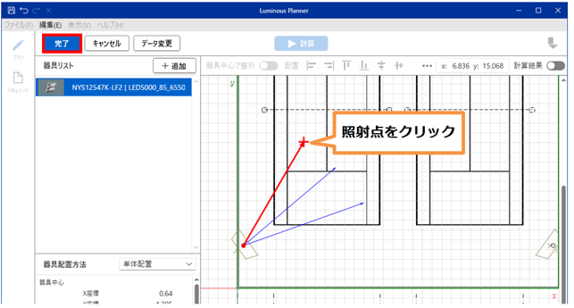 - メインビュー上で照明器具の照射方向を+カーソルでポイントし、設定後「完了」をクリックします。