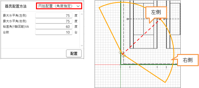:指定した円弧範囲内に配置する器具の台数を入力します。両端から配置されます。 |