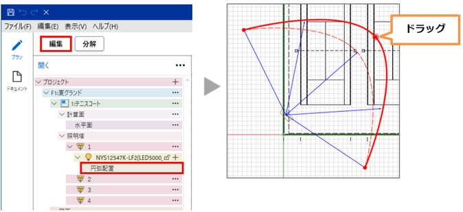 円弧配置後、設定した円弧を編集できます。