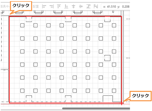 長方形入力 +カーソルで部屋/スペース形状の対角線上の頂点を指定することで長方形状を設定します。 図面読み込みをしている場合、下図のように図面を下絵に表示して操作することができます。