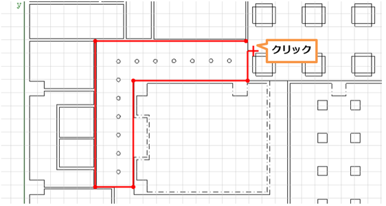 多角形入力 +カーソルで多角形形状の頂点を設定します。 図面読み込みをしている場合、下図のように図面を下絵に表示して操作することができます。 入力を間違った場合、BackSpaceキーで一つ前の頂点に戻ります。 Shiftキーを押しながら線をひくと軸平行な線がひけます。