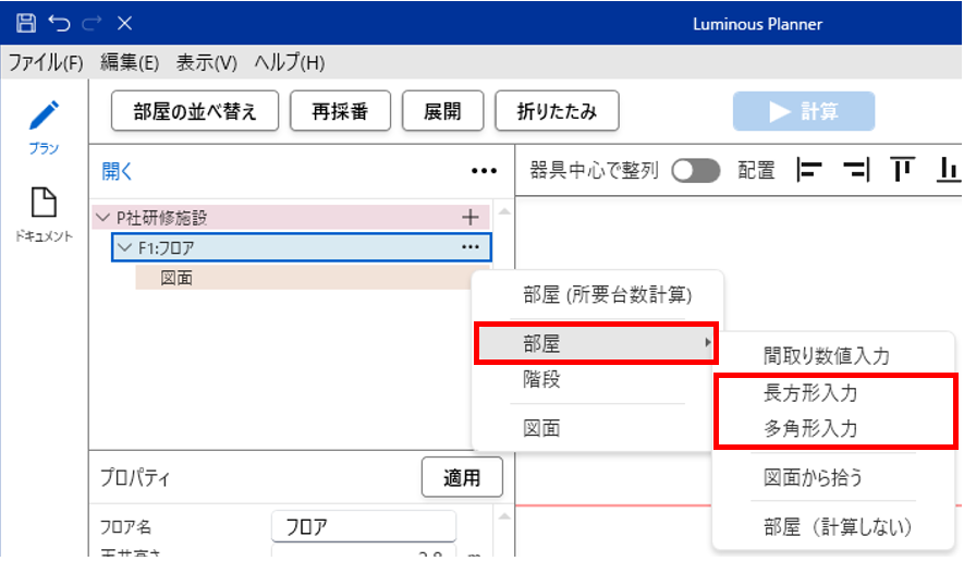 フロア「…」→「部屋/スペース(屋外)」から「長方形入力」または「多角形入力」を選択します。