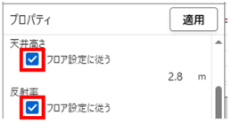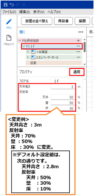 1. ツリーより一括変更するフロア(例:1F)を選択し、プロパティ画面の「天井高さ」「反射率」を変更後、「適用」をクリックします。