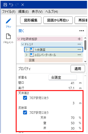 1. ツリーより変更対象の部屋を選択すると、プロパティ画面の「天井高さ」「反射率」が変更されていることが確認できます。