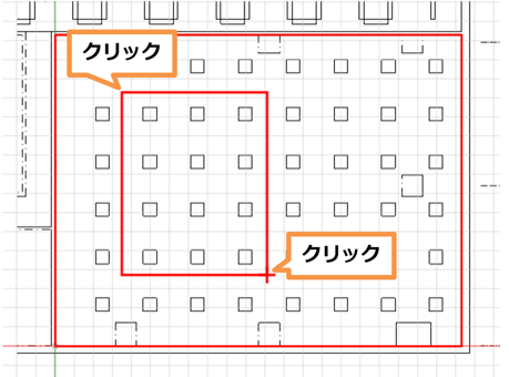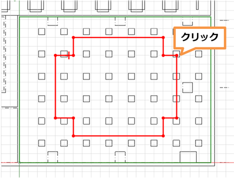 第4章 プラン編集4.3 計算エリアの設定 長方形入力/多角形入力 長方形入力 +カーソルで計算エリア設定する範囲の角を指定することで、長方形状を設定します。 図面読み込みをしている場合、下図のように図面を下絵に表示して操作することができます。 多角形入力 +カーソルで多角形形状の頂点を設定します。 図面読み込みをしている場合、下図のように図面を下絵に表示して操作することができます。 ※形状確定前 入力を間違った場合、キーボード「BackSpace」ボタンで一つ前の頂点に戻ります Shift を押しながら線をひくと軸平行な線がひけます。 ※確定後の編集は「部屋/スペース形状の変更」を参照ください。