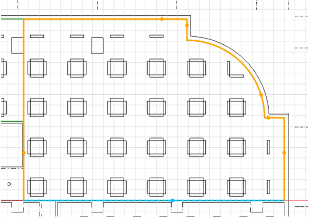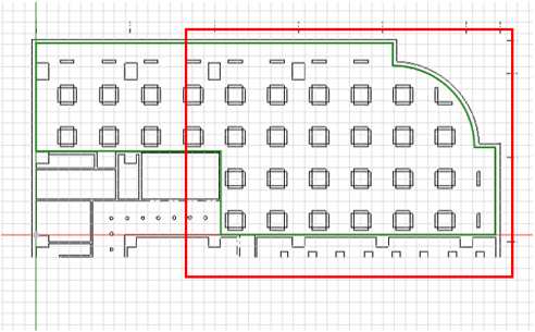 第4章 プラン編集4.3 計算エリアの設定図面から拾う DXF、DWG図面から拾う ※必ずフロアに図面を読み込み部屋/スペースを設定してから計算エリア設定を行ってください。 1. マウスのホイールでメインビューから設定する部屋/スペースへズームを行い、見やすく設定します。 2. 計算エリア形状をDXF、DWG図面の線分を選択し拾い出します。設定後「完了」をクリックします。