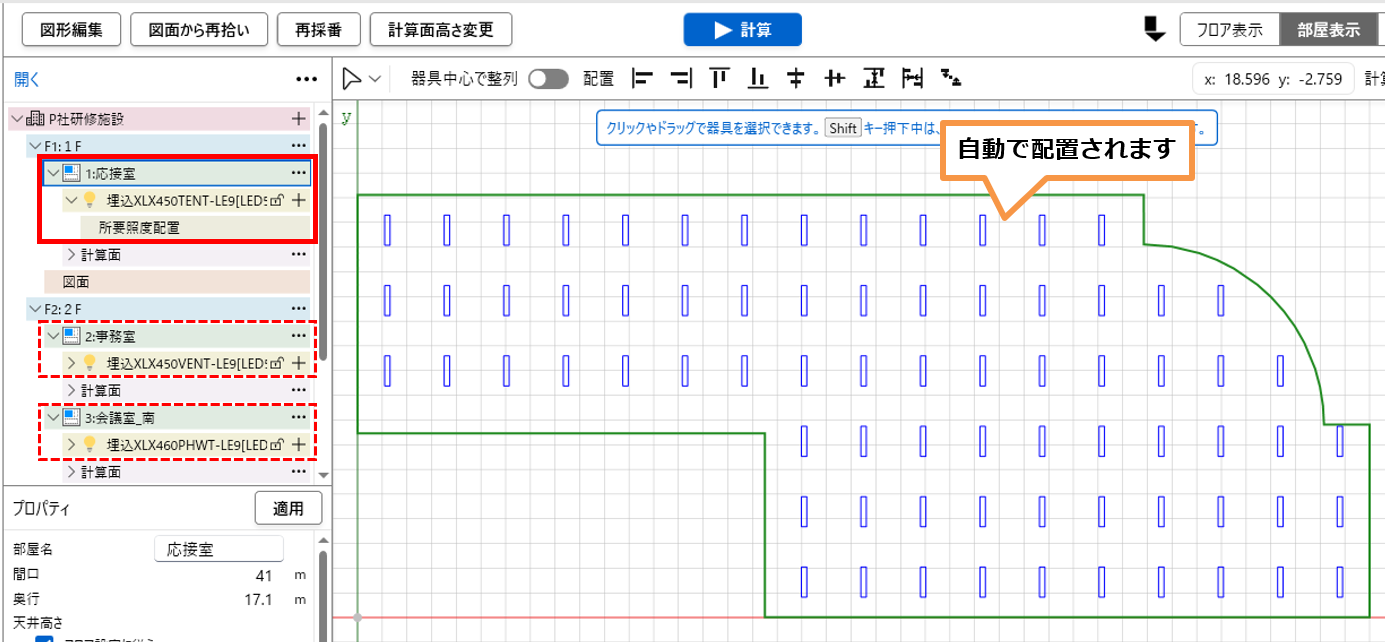 - 部屋に器具が自動で配置されます。