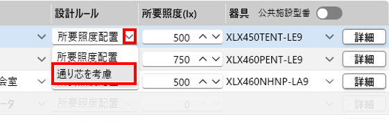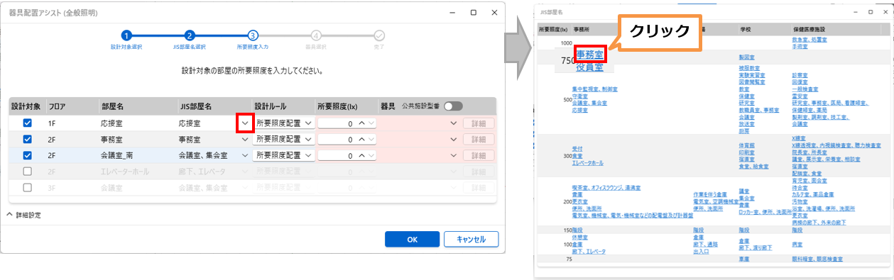 - 「JIS部屋名」のプルダウンを選択すると、JISの照度基準表が表示されますので、該当の部屋を選択します。