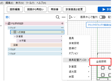 - ツリーより部屋/スペース(例:応接室)「…」→「器具配置アシスト」→「全般照明」を選択します。