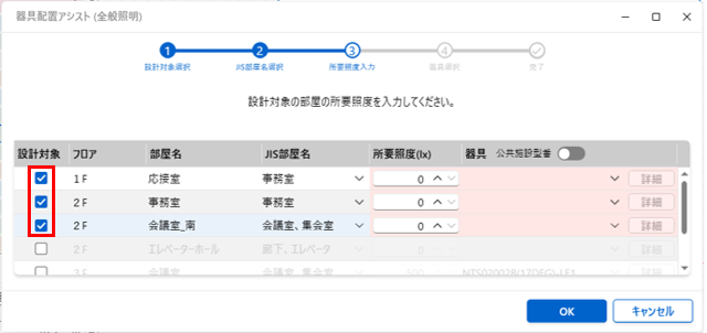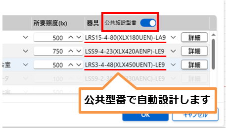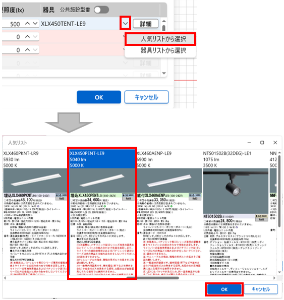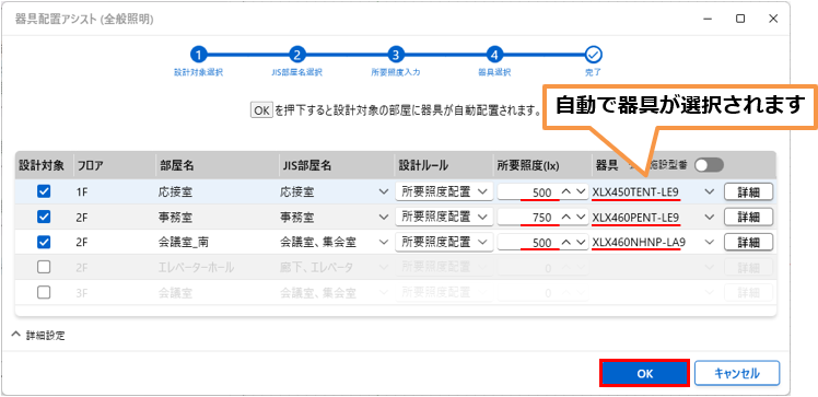 - 所要照度が自動で入力された後、続けて器具が自動で選択されます。「OK」ボタンを押します。