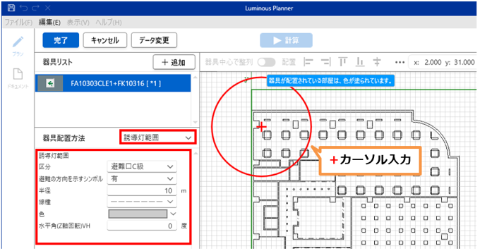 第4章 プラン編集4.8 誘導灯/オプションの設定 誘導灯範囲 誘導灯の有効範囲を表示する方法です。 区分 :誘導灯の区分を選択します。 非難の方向を示すシンボル :シンボルの有無を選択します。 半径 :範囲円の大きさを自動で入力します 線種 :範囲円の線種を設定します。 色 :範囲円の色の設定します。 水平角 :照明器具のZ 軸回転角度を設定します。