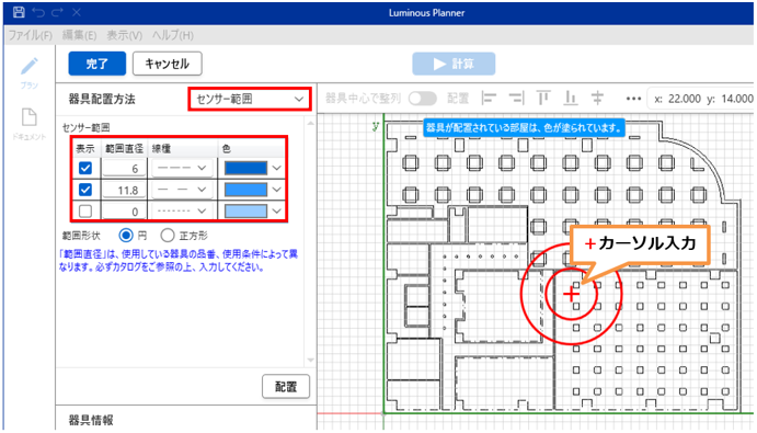 「図面から拾う」「図面のラインに沿って配置」の設定方法については、 【4.12 照明器具 器具配置方法】をご参照ください。 |