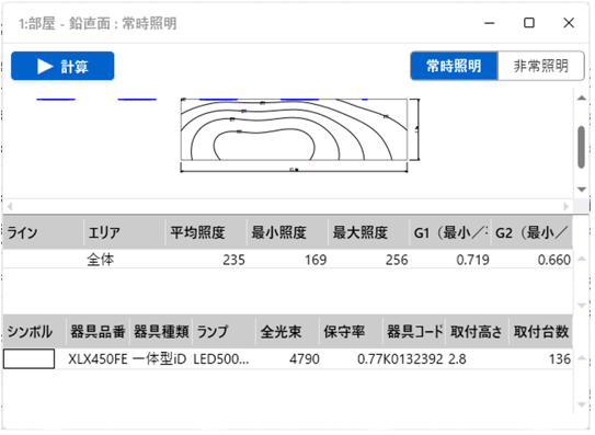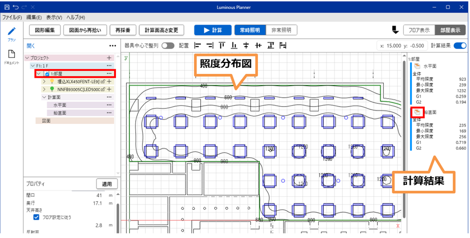 第5章 照度分布図5.1 照度計算 照度分布図を表示する 照度計算が終わったら、メインビューに照度分布図と、エリアごとの平均照度、最小照度、最大照度などの計算結果が表示されます。 ■鉛直面の照度分布図を表示する 鉛直面はフローティングでみる必要があるため、上図の で示したフローティングボタンをクリックします。