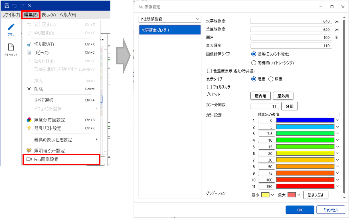 :グラデーション表示の色数を指定します。 グラデーションカラーの設定をします。 照度や輝度値毎にはっきりと色分けしたい場合は同じ値を2回ずつ入力します。