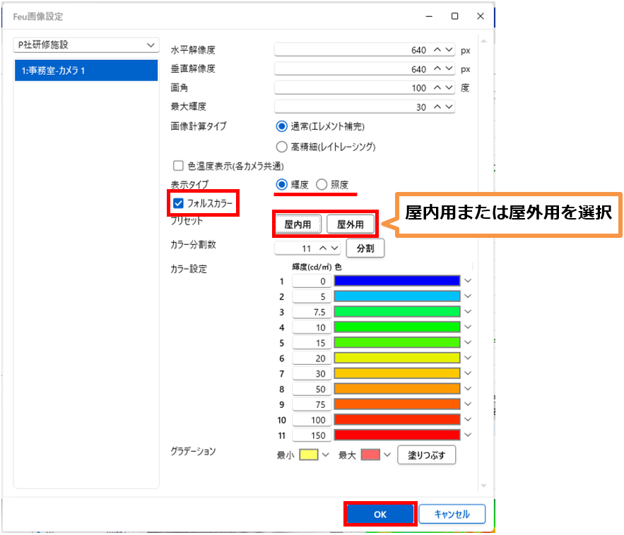 1. 表示タイプを選択し、フォルスカラーにチェックを入れ、プリセットの「屋内用」または「屋外用」を選択します。
