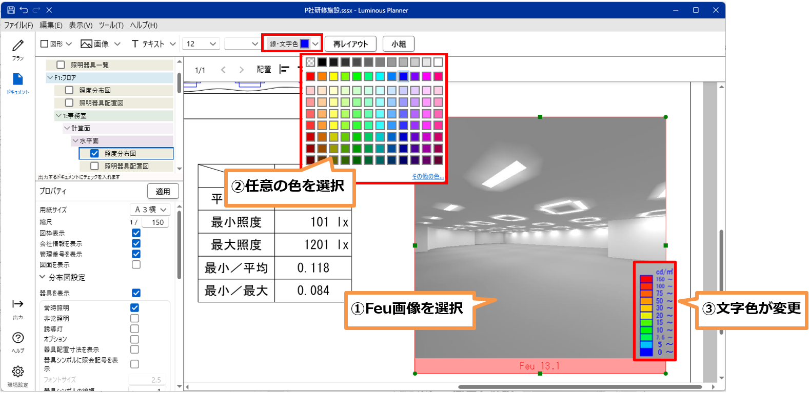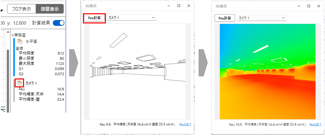 1. 「フローティングボタン」をクリックし、「Feu計算」ボタンをクリックするとカラーで表示されます。