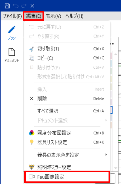 1. メニューバーの「編集」から「Feu画像設定」を開きます。