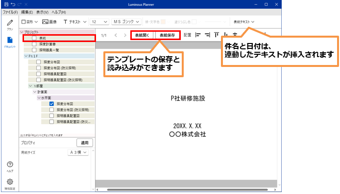 表紙をファイルに保存し、一度テンプレートを作成すれば、次回からは「表紙を開く」からテンプレートを読込むだけで簡単に表紙が作成できます。