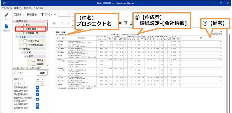 照度計算書が用紙サイズよりはみ出す場合は、フォントサイズで調整します。