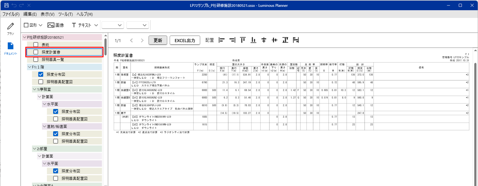 モードボタン「ドキュメント作成」をクリックし、ツリーより「照度計算書」をクリックします。