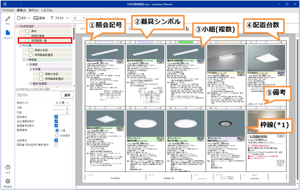 使用した照明器具の一覧を出力します。ツリーより「照明器具一覧」をクリックします。