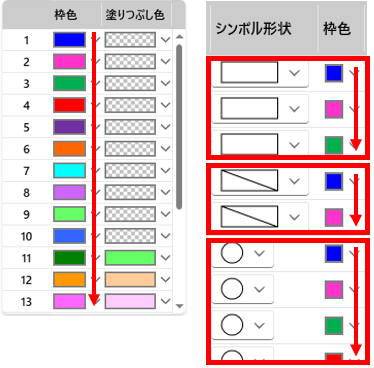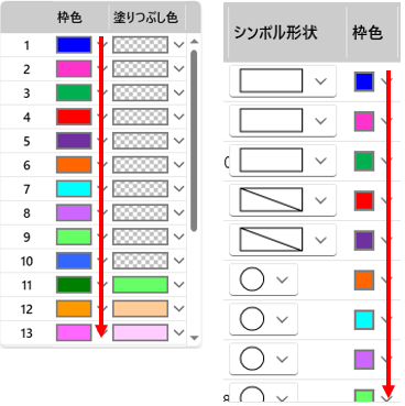 ⑥器具ごとに配色 シンボル形状ごとに配色 |