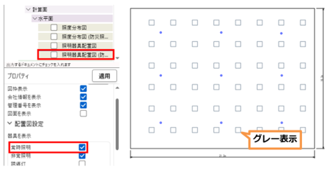 非常灯配置図に常用照明を表示した場合、常用照明はグレーで表示されます。
