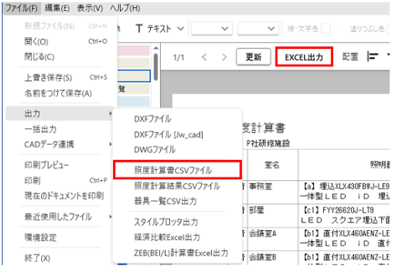 照度計算書をCSVやExcel形式のファイルに出力できます。