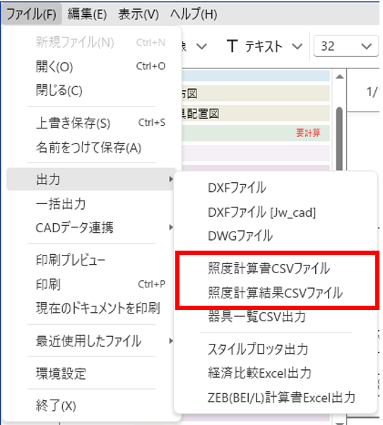 メニューバー「ファイル」→「出力」から「照度計算結果」や「照度計算結果」をCSV出力する事ができます。