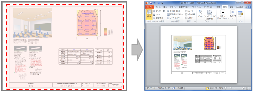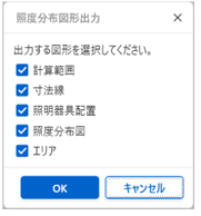 第6章 ドキュメント6.9 ドキュメントの出力 ドキュメントのコピー ドキュメントの内容をクリップボードコピー機能でPowerPointなどに貼り付けることが可能です。 メインビューでコピーしたい範囲をマウスで選択し、メニューバー「編集」→「コピー」でクリップボードに記憶し、PowerPointなどに貼り付けます。 ■照度分布図形出力 照度分布図をコピーすると「照度分布図形出力」の画面が表示されますので、 出力する図形を選択して「OK」をクリックします。