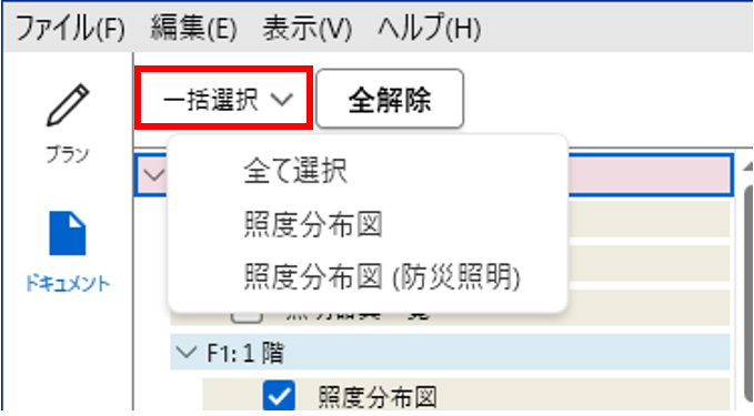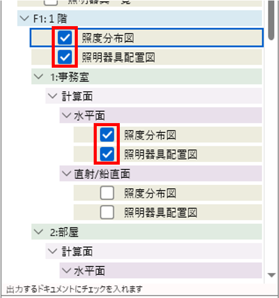 :照度分布図・照度分布図(防災照明)・照明器具配置図を全選択します。