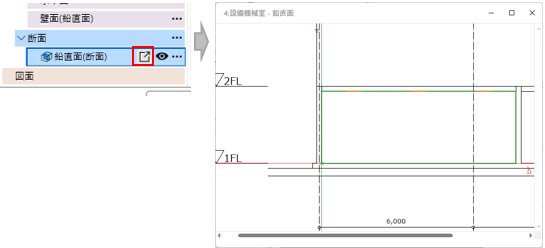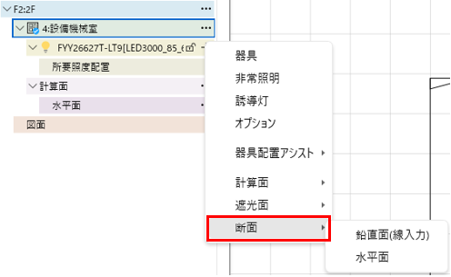 - ツリーより「部屋(例:設備機械室)」-「…」-「断面」から作成する断面(鉛直面または水平面)を選択し、追加を行います。