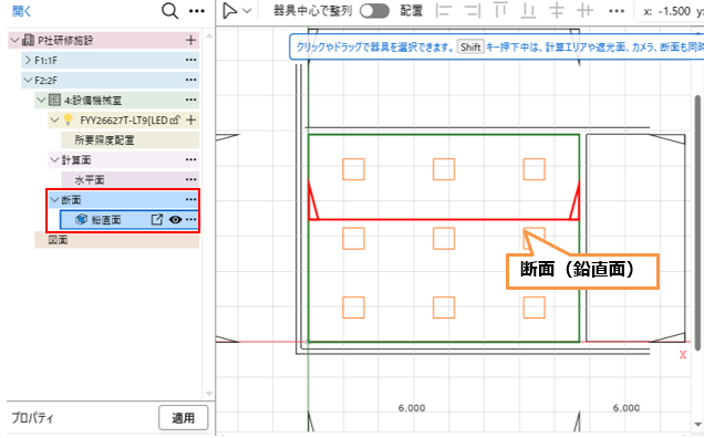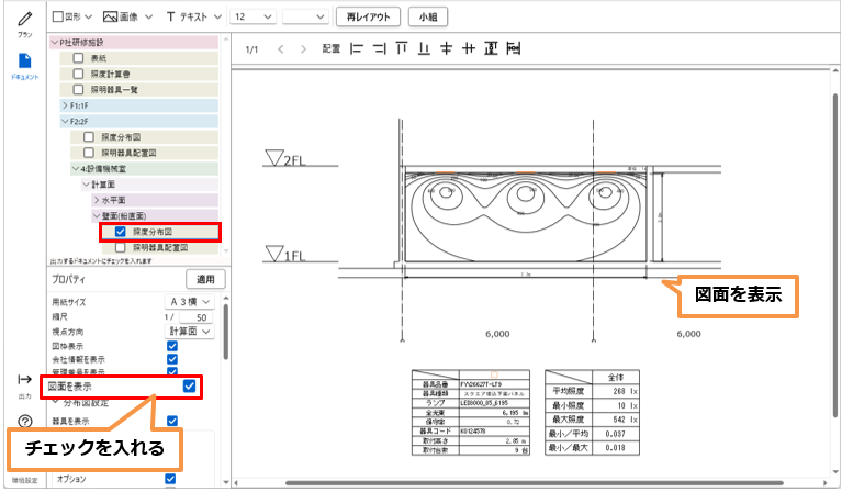 計算面(例:壁面(鉛直面))の照度分布図のプロパティから「図面を表示」にチェックを入れることで、ドキュメント上にも図面の表示が可能です。