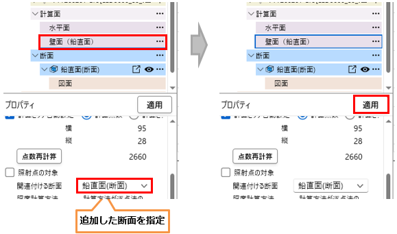 - 計算面 (例:壁面(鉛直面))を選択し、画面左下のプロパティで「関連付ける断面」を指定し、適用ボタンを押します。